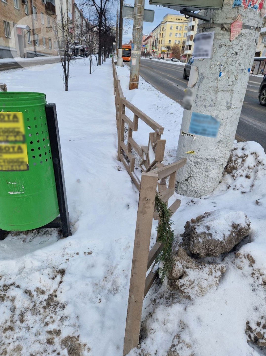 Ижевск. Удмуртия. Новый забор на улицах Советской и Ленина был повреждён во время зимней эксплуатации. Это видно на соответствующих фотографиях.