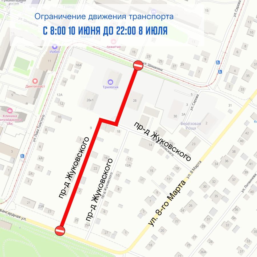 С 8.00 10 июня до 22.00 8 июля будет временно ограничено движение транспортных средств по проезду Жуковского, на участке от ул. Авангардной до пересечения с ул. Шишкина.